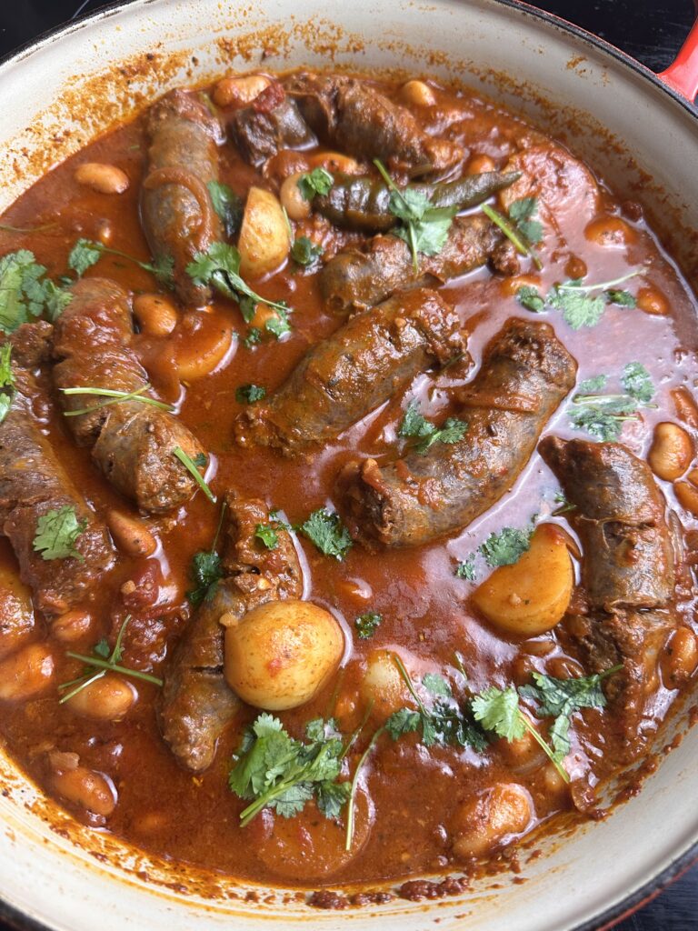 A simple, hearty one-pot meal made with boerewors, baby potatoes, butter beans and a rich tomatoey sauce. Perfect for an easy family dinner.
