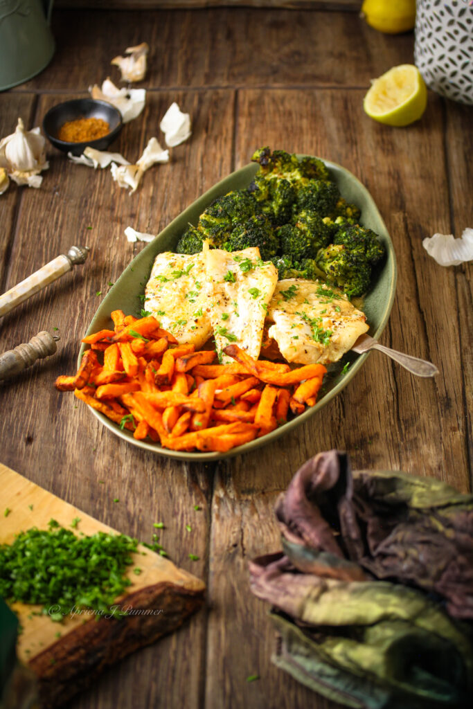 - On a separate tray, roast sweet potato fries and broccoli florets with olive oil, salt, and pepper at the same time — 20–25 minutes or until golden and crisp.
